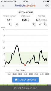 The screenshot shows that like investments, BG readings can fall as well as rise, and sometimes quite quickly which has big downsides. If I am working quietly at home, I will shorten the scan frequency to 20 minutes and I get a good insight from that. There are times, though, when that doesn’t work – like in business meetings where it is just inconvenient or disruptive, or on long car journeys where it is actually illegal.