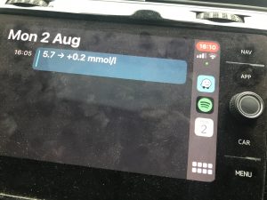 In the car, with the right technology, it gets even better. I drive a 2019 VW Golf (a brilliant piece of kit anyway) and with CarPlay I can see calendar items on the screen. As with the watch, every five minutes I can see my BG and if it is starting to move then I can do something about it. In this case I can see that a few minutes after the watch reading I am still fluctuating around the 5.5 level, and so in pretty good shape.
